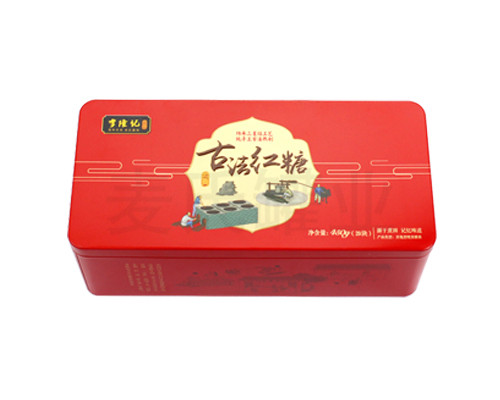 此款方形紅糖馬口鐵盒,采用國產0.23mm馬口鐵精心打造而成,具有良好的防腐性,密封性,抗壓性等特點。本鐵盒為長方形鐵盒,扣底縮口罐,蓋內卷結構,不傷手。罐身可做雕刻,目的在于將鐵盒品牌以立體化的方式展現給消費者,對消費者產生一種視覺上的沖擊效果,從而起到一種無形的宣傳作用。
